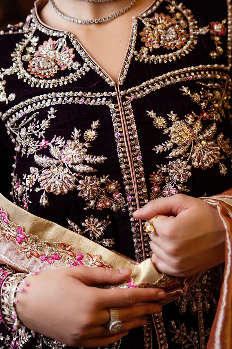 Chasing Reflections features exquisite embroidered, sequined velvet panels, showcasing stunning craftsmanship with a captivating front motif and elegant daman border. The luxurious embroidered, sequined zari dupatta and raw silk trousers complete the look, while exclusive handmade tassels on the sleeves add a unique touch.