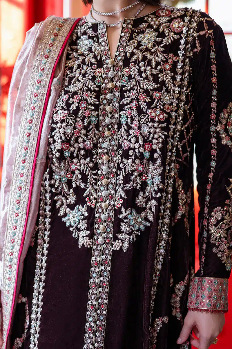 A masterpiece in velvet adorned with intricate embroidery and shimmering sequins across the